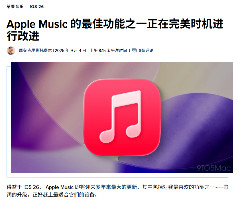 9月4日,科技媒体9to5Mac发布博文称,苹果为其iOS 26系统升级了Apple Music的歌词体验,引入歌词翻译和歌词发音两项功能。预计在2026年春季上市的带屏幕HomePod,也将搭载这两项歌词功能。
