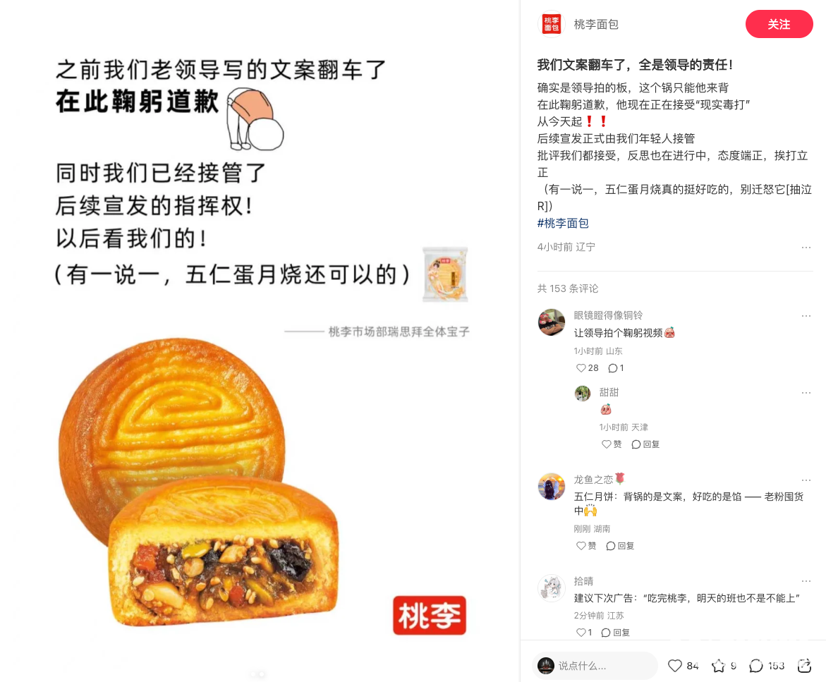 近几年不少消费品牌在节日营销中翻车,核心原因在于传统的“领导拍板”式决策模式与年轻消费群体的表达偏好脱节。桃李此次明确宣布由年轻人接管宣发,或许意味着公司将更多尝试贴近新一代用户的沟通方式,推动品牌形象重塑。