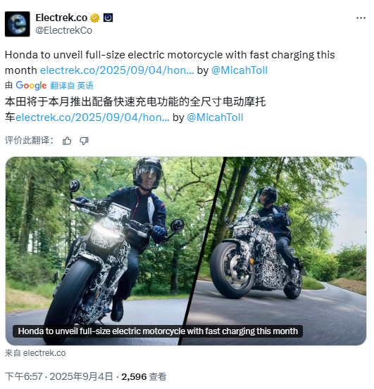 9月4日,汽车媒体electrek发文称,本田将于9月16日发布首款全尺寸电动摩托车,支持直流快充技术。该公司之前曾描述新车型的续航里程超过100公里,足以满足城市使用。新车型的预告图片也清楚地展示了CCS Combo 2充电端口(该端口在欧洲用于快速充电),但目前尚未提供可靠的电池容量信息。