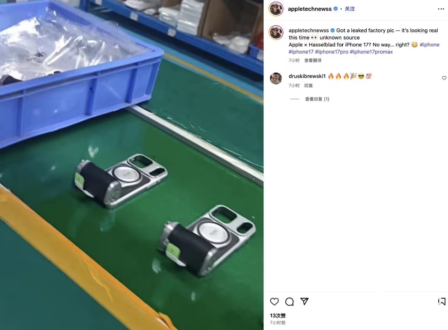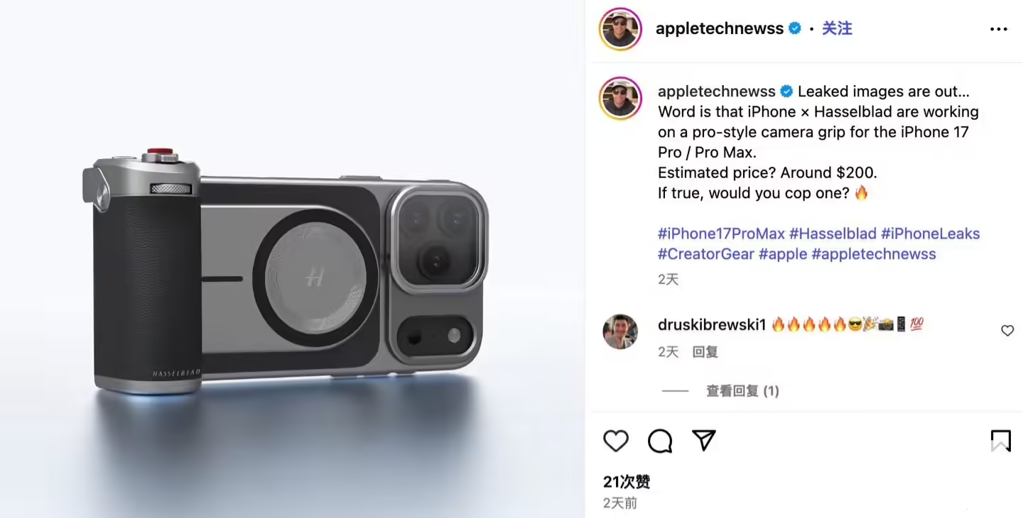 近日,外媒Appletechnews曝光谍照称,哈苏计划为苹果即将发布的iPhone 17 Pro/Max系列推出拍照手柄外设。该产品将配备快门按键和变焦旋钮,并印有哈苏品牌标识,预计售价约200美元,折合人民币约1428元。