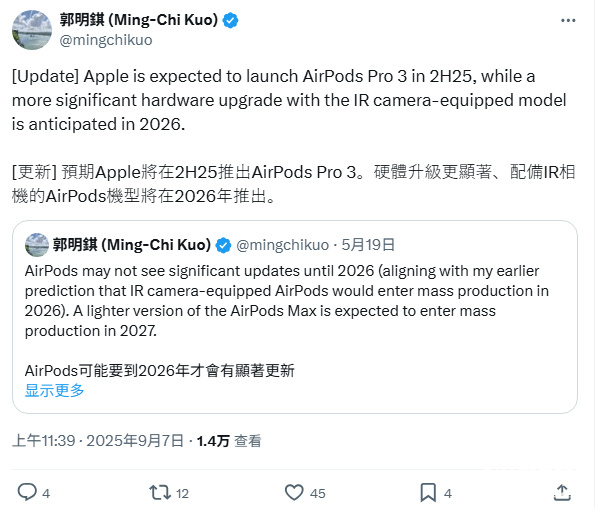 9月7日,苹果产业链分析师郭明錤发布最新预测,苹果计划于2025年下半年推出AirPods Pro3,并确认2026年将推出配备IR红外摄像头的新品。