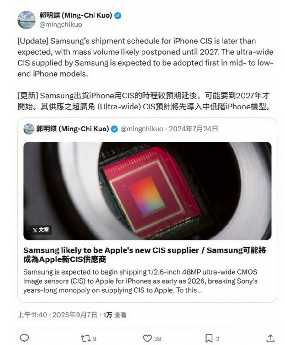 9月7日,知名苹果产业链分析师郭明錤发布最新预测,苹果计划于2025年下半年推出AirPods Pro3,并确认2026年将推出配备IR红外摄像头的新品。同时,三星为iPhone供应CIS(CMOS图像传感器)的时间可能推迟至2027年。