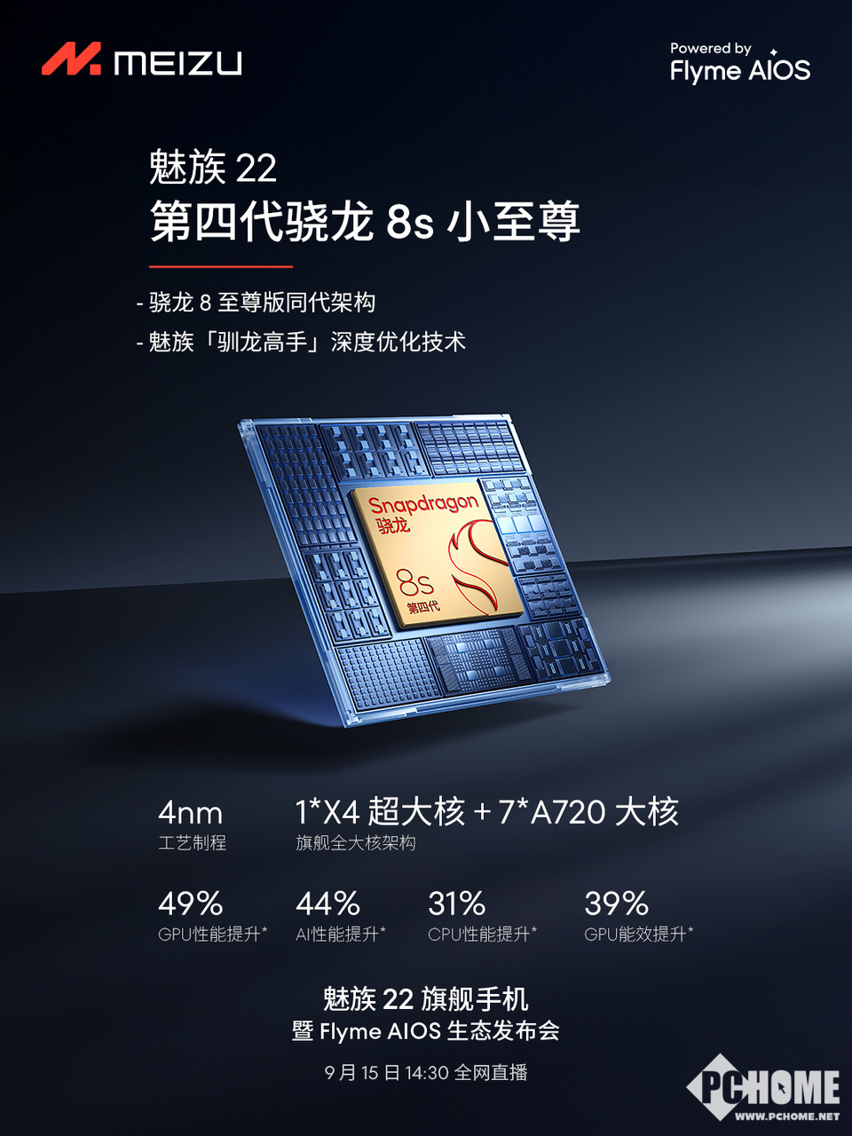 据官方透露,魅族22将搭载第四代骁龙8s移动平台。该芯片基于台积电4nm工艺打造,采用“1超7大”核心架构,CPU性能提升31%,集成Adreno 825 GPU,能效提升39% ,已在iQOO Z10 Turbo Pro、Redmi Turbo 4 Pro等机型中投入使用,是一款中端处理器。