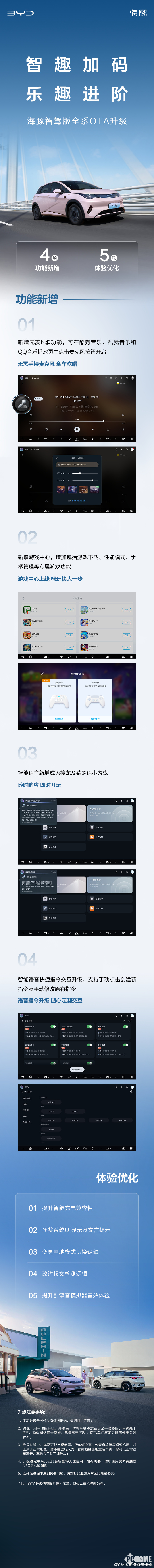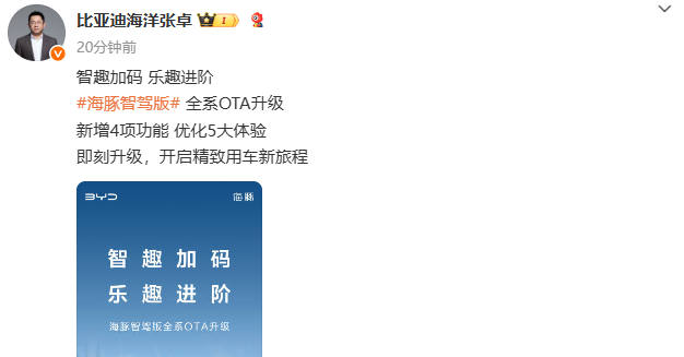 9月8日,比亚迪海洋网总经理张卓发文表示,海豚智驾版正式启动全系OTA升级,将为用户带来4项新增功能与5大体验优化,进一步提升这款明星车型的智能出行体验。此次升级覆盖超90万海豚智驾版用户,无需到店即可免费获取。