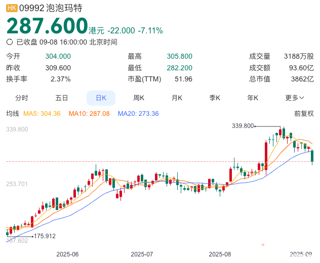 2025年9月8日,泡泡玛特股价下跌7.11%,报收287.6港元/股。值得注意的是,自2025年8月达到339.8港元/股的高点后,泡泡玛特股价持续下探,近半个月累计跌幅为15.3%。