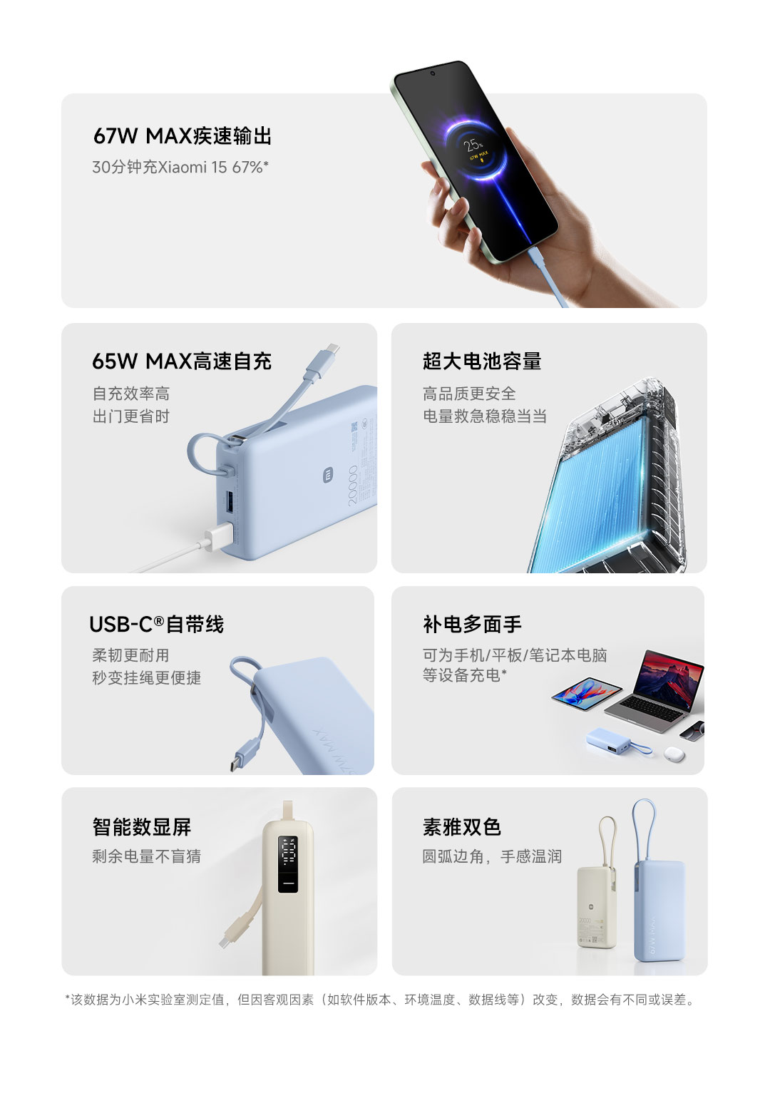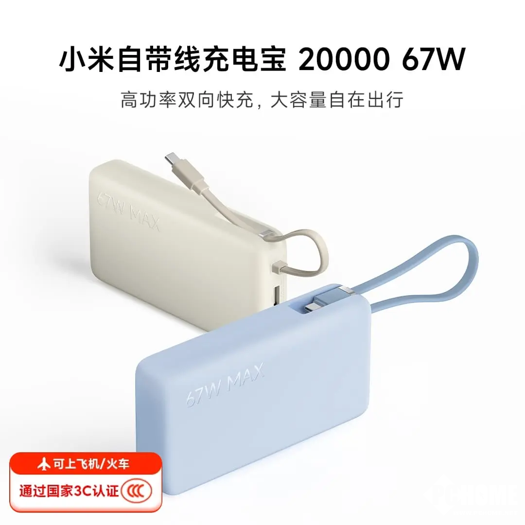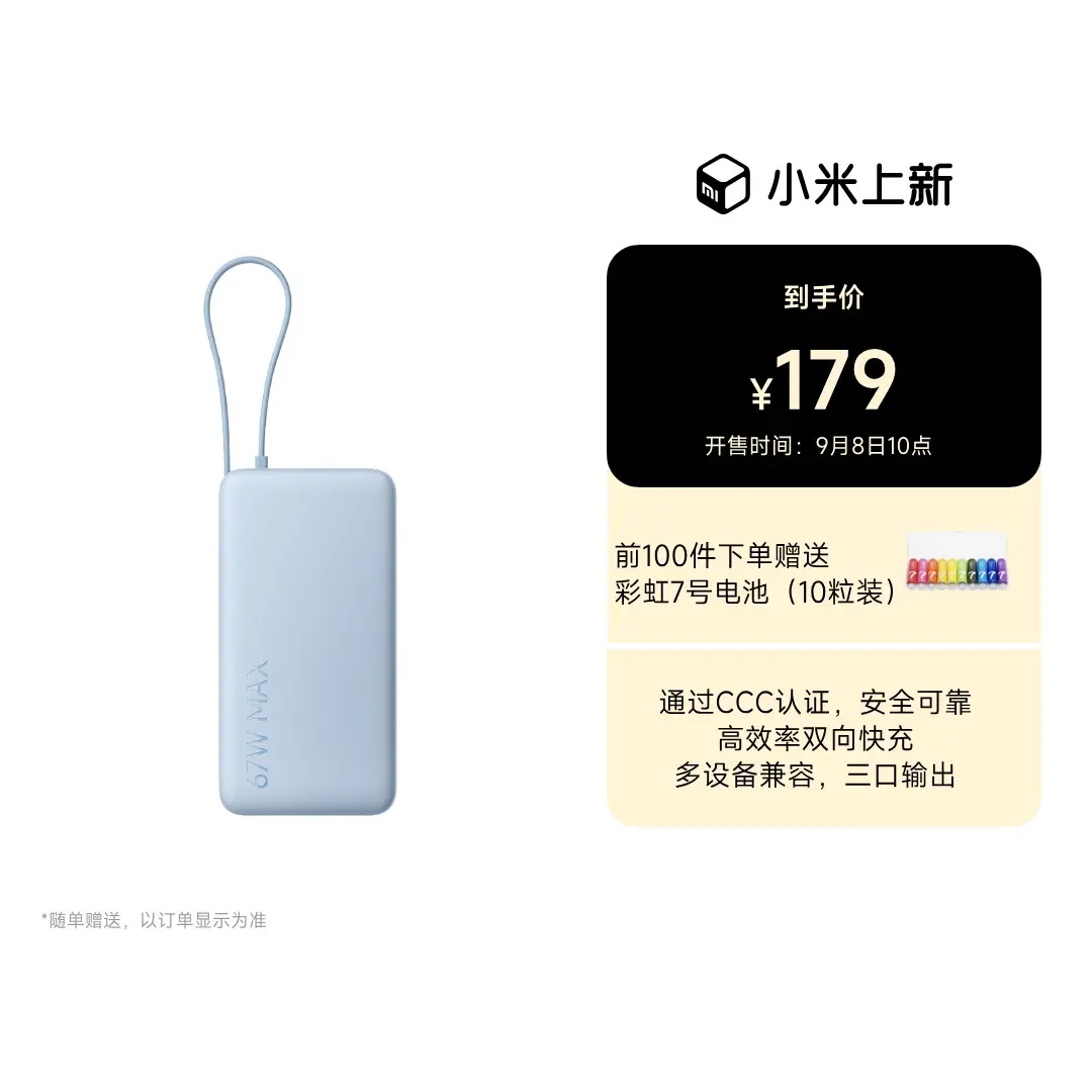 9月8日,小米自带线充电宝20000mAh 67W开启全渠道售卖,售价179元。这款新品作为老款33W机型的升级替代款,凭借高容量、快充能及多设备兼容特性,成为差旅用户续航解决方案的新选择。