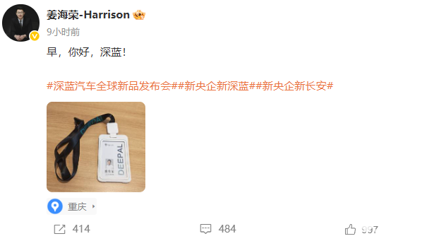 9月8日,长安汽车旗下新能源品牌深蓝汽车正式官宣:荣耀前中国区CMO姜海荣出任公司CEO,全面负责品牌运营与市场拓展。