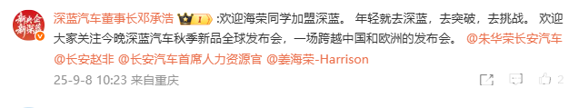 此次跨界任命直指深蓝汽车发展痛点:作为年销超24万辆的新能源品牌,深蓝2025年1-8月累计销量19.86万辆,但面临“产品力强却品牌声量不足”的挑战。