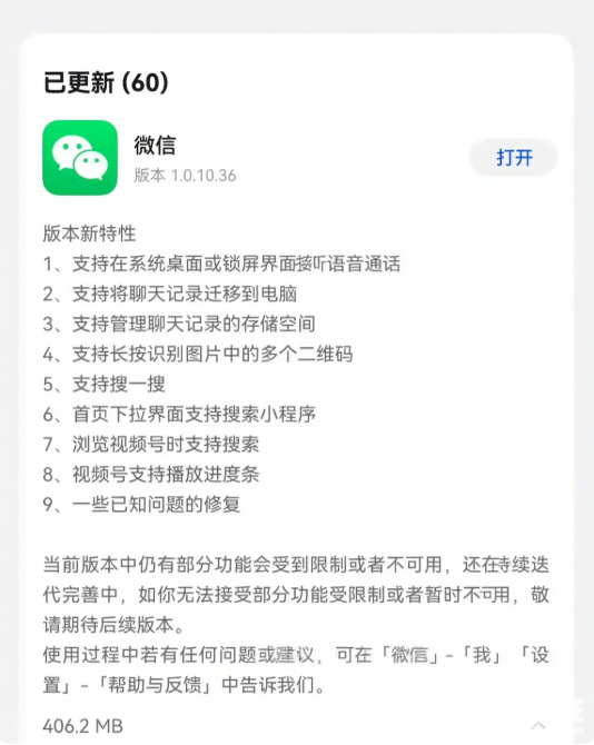 9月8日,微信鸿蒙版App在华为应用市场开启1.0.10.36正式版本升级,带来多项功能更新,进一步深化与鸿蒙系统的融合体验。