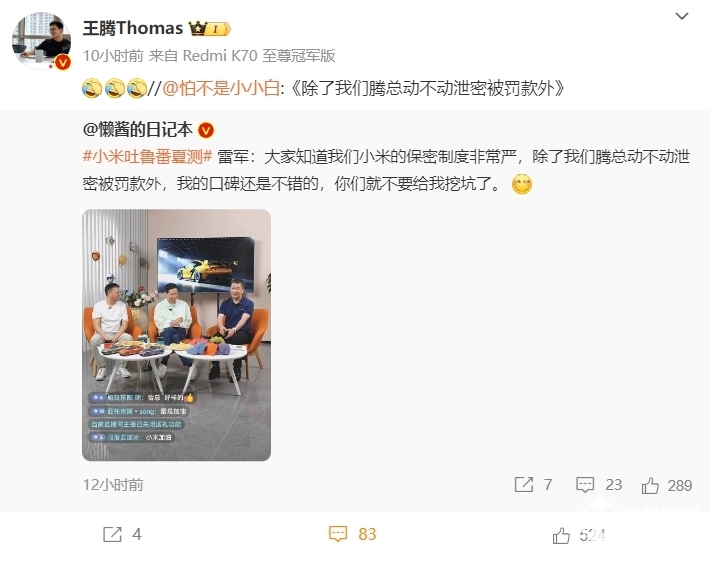 值得注意的是,此前王腾就屡屡因泄密而被小米处罚或被其他高管提醒。比如,2022年2月,王腾因在微博泄露Redmi K50发布时间,被小米判定为“二级泄密”,处以警告处分、扣罚奖金5000元,并取消年度晋升资格。2025年6月,小米公关负责人王化在社交媒体平台发文称,王腾被要求单独签署保密协议,并在评论区提醒:“别再瞎泄密,否则罚不容情!”