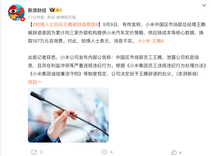 网传信息显示,2024年10月起,王腾多次向三家外部机构提供小米汽车(SU7)定价策略、供应链成本等核心商业机密,累计收受咨询费187万元。不过新浪财经援引知情人士消息称,该消息不实。