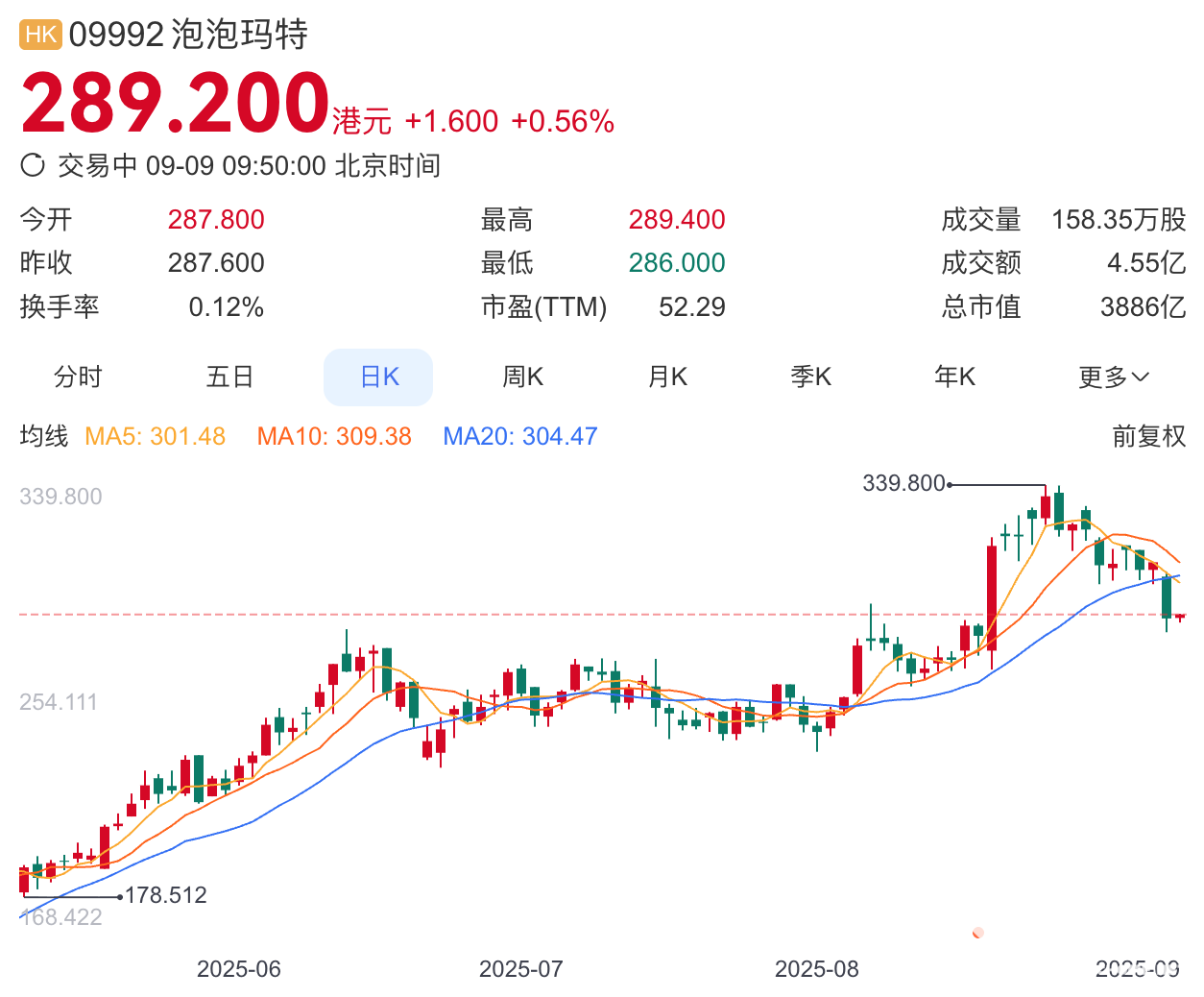 二级市场上,泡泡玛特股价表现也不容乐观。自2025年8月末达到339.8港元/股的高点后,泡泡玛特股价便持续下探。尤其是在LABUBU价格崩盘消息传出后,近半个月累计跌幅约为15%。市场对泡泡玛特未来营收增长及IP热度持续性产生担忧,投资者信心受挫,纷纷抛售股票,导致股价大幅下跌。
