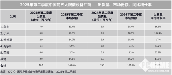 9月9日,IDC最新数据显示,2025年第二季度中国腕戴设备市场出货量达到2080万台,同比增长33.8%。其中,智能手表出货量为1460万台,同比增长31.0%;手环出货量为621万台,同比增长40.8%。