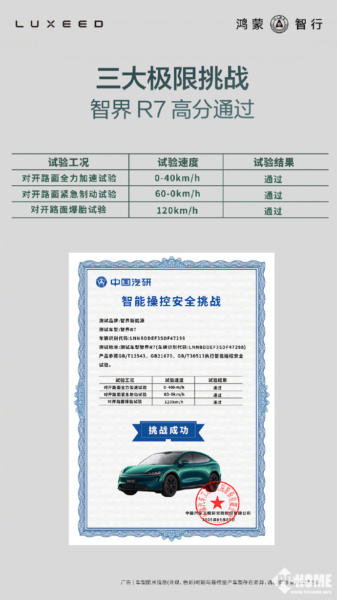 根据中国汽车工程研究院股份有限公司出具的测试报告,智界R7在对开路面全力加速试验(0-40km/h)、对开路面紧急制动试验(60-0km/h)以及对开路面爆胎试验(120km/h)三个项目中均顺利通过。测试严格参照GB/T12543、GB21670和GB/T30513国家标准执行。