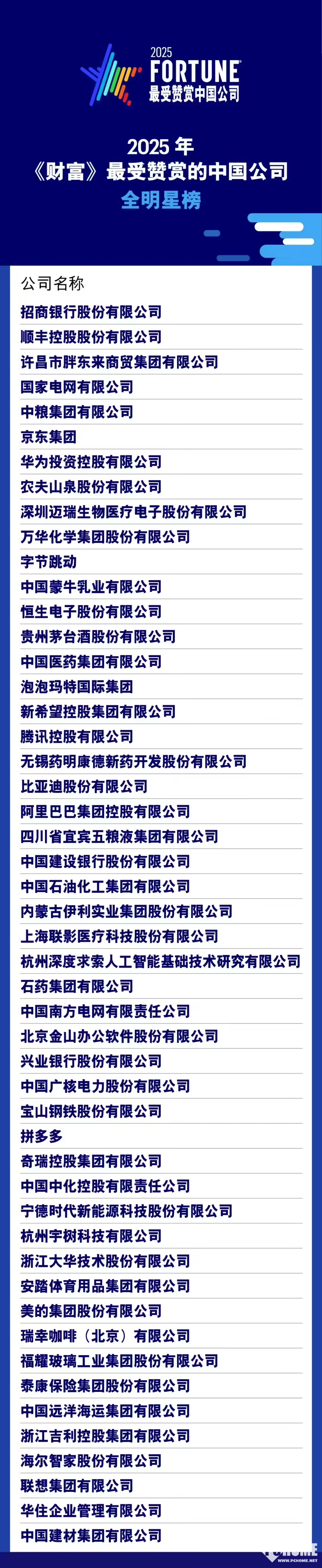 今日,《财富》杂志发布了2025年“最受赞赏的中国公司”榜单,涵盖金融、零售、科技、能源、制造等多个行业。