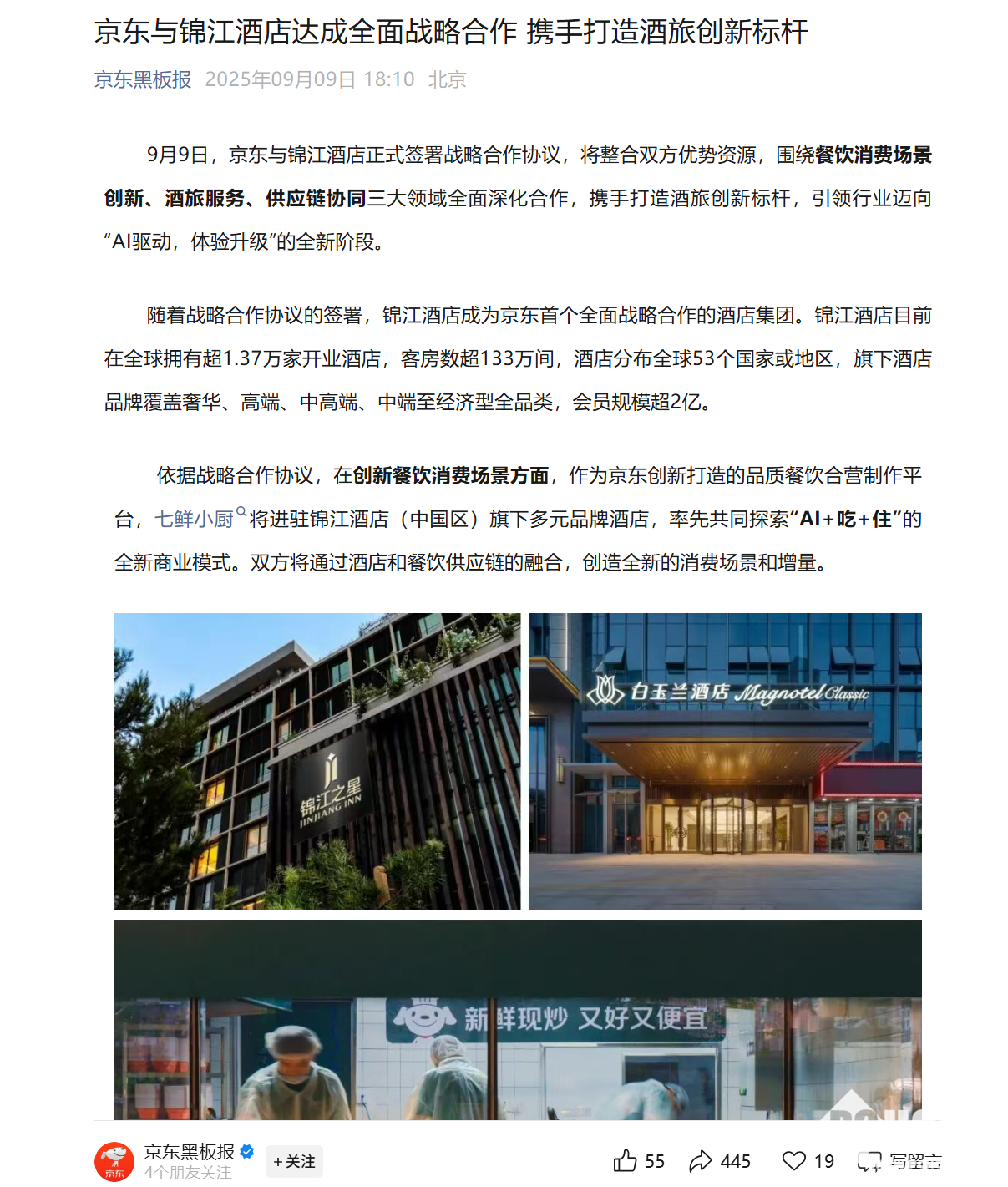 9月9日,京东与锦江酒店正式签署战略合作协议,双方将整合优势资源,围绕餐饮消费场景创新、酒旅服务、供应链协同三大领域展开全面合作。锦江酒店也借此成为京东首个全面战略合作的酒店集团。
