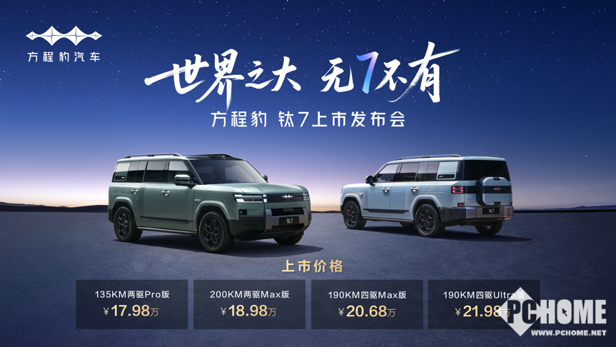 2025年9月9日,比亚迪最新开创之作“大五座天花板”——方程豹钛7正式上市,新车共推出4个配置版本,售价17.98万元-21.98万元:其中,135KM两驱Pro版17.98万元,200KM两驱Max版18.98万元,190KM四驱Max版20.68万元,190KM四驱Ultra版21.98万元,款款越级,款款超值,下单即刻享受最高价值超3.6万元的上市权益。