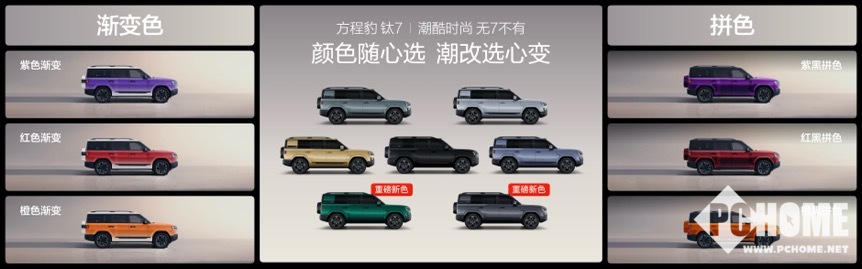 为了让广大用户选得尽兴,钛7直接一步到位,带来了7款外观颜色、3款内饰颜色,同步在官方商城上架了6款潮改方案,可满足不同用户的审美偏好。