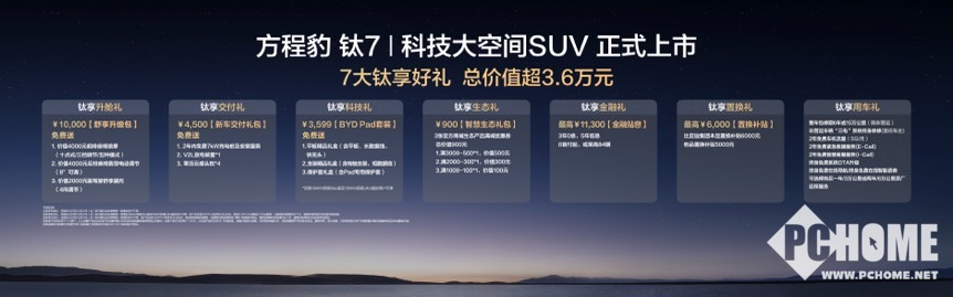 在购车权益上,方程豹更是诚意十足,为首批车主带来了总价值最高超3.6万元的7大钛享好礼!其中包括:覆盖多项座椅舒适配置的总价值10000元舒享升级包、价值3599元的BYD Pad套装、价值4500元的新车交付礼包均免费送;提供3年0息、5年低息、0首付起或至高84期等多重金融方案以供选择,金融贴息最高价值11300元;还有最高价值6000元的置换补贴、价值900元的智慧生态礼包,以及2年5G每个月的免费车机流量、非营运车辆长达6年或15万公里的整车包修、“三电”系统的终身保修、终身免费系统OTA升级等,让每一个家庭都能轻松拥抱钛7,让美好生活触手可及。