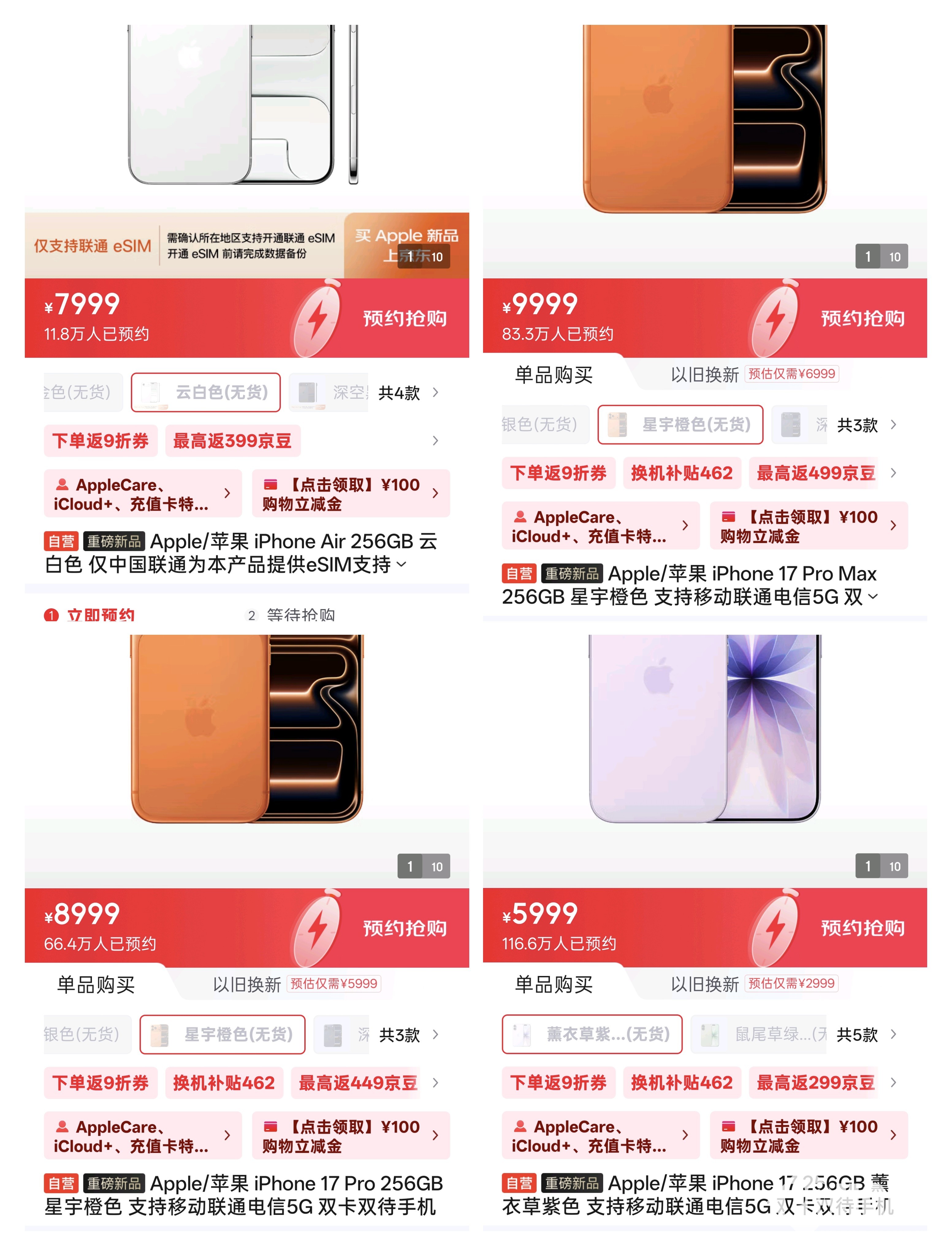 PChome了解到,目前在京东平台,iPhone 17系列中,iPhone 17标准版的预约量为116.5万,iPhone 17 Pro的预约量为66.4万,iPhone 17 Pro Max的预约量为83.3万,iPhone Air的预约量为11.8万。