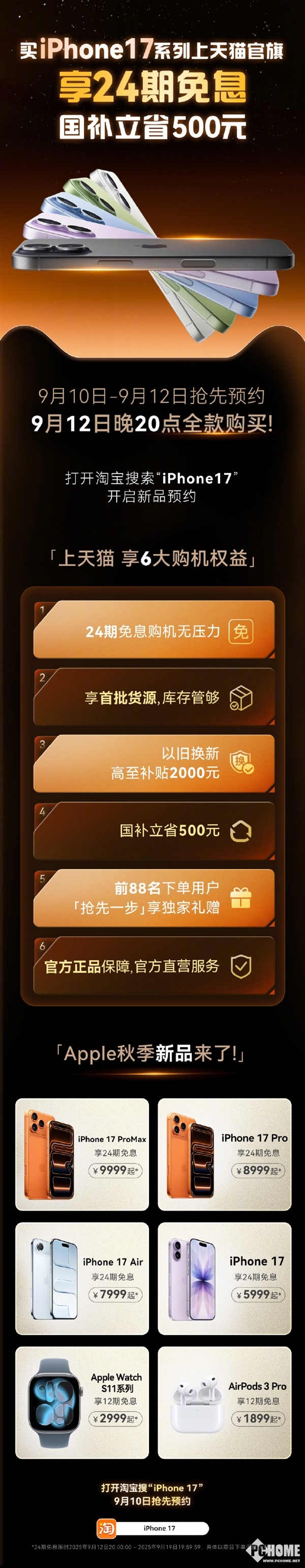 天猫平台在推出24期免息的同时,天猫平台为官方直营、首批货源充足,并支持以旧换新,最高可享2000元补贴。值得注意的是,购买6000元以下指定机型可享受国家补贴500元,iPhone 17标准版256GB版本补贴后价格降至5499元。