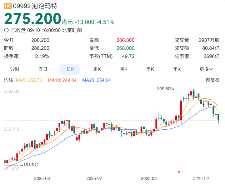 二级市场价格的剧烈波动,也影响到了资本市场。泡泡玛特股价在8月26日触及339.8港元/股的历史高点后,一路下行。9月8日更是大跌7.5%,跌破300港元/股。9月10日,泡泡玛特股价报收275.2港元/股,单日跌幅4.51%。最近半个月,泡泡玛特股价累计跌幅约20%。