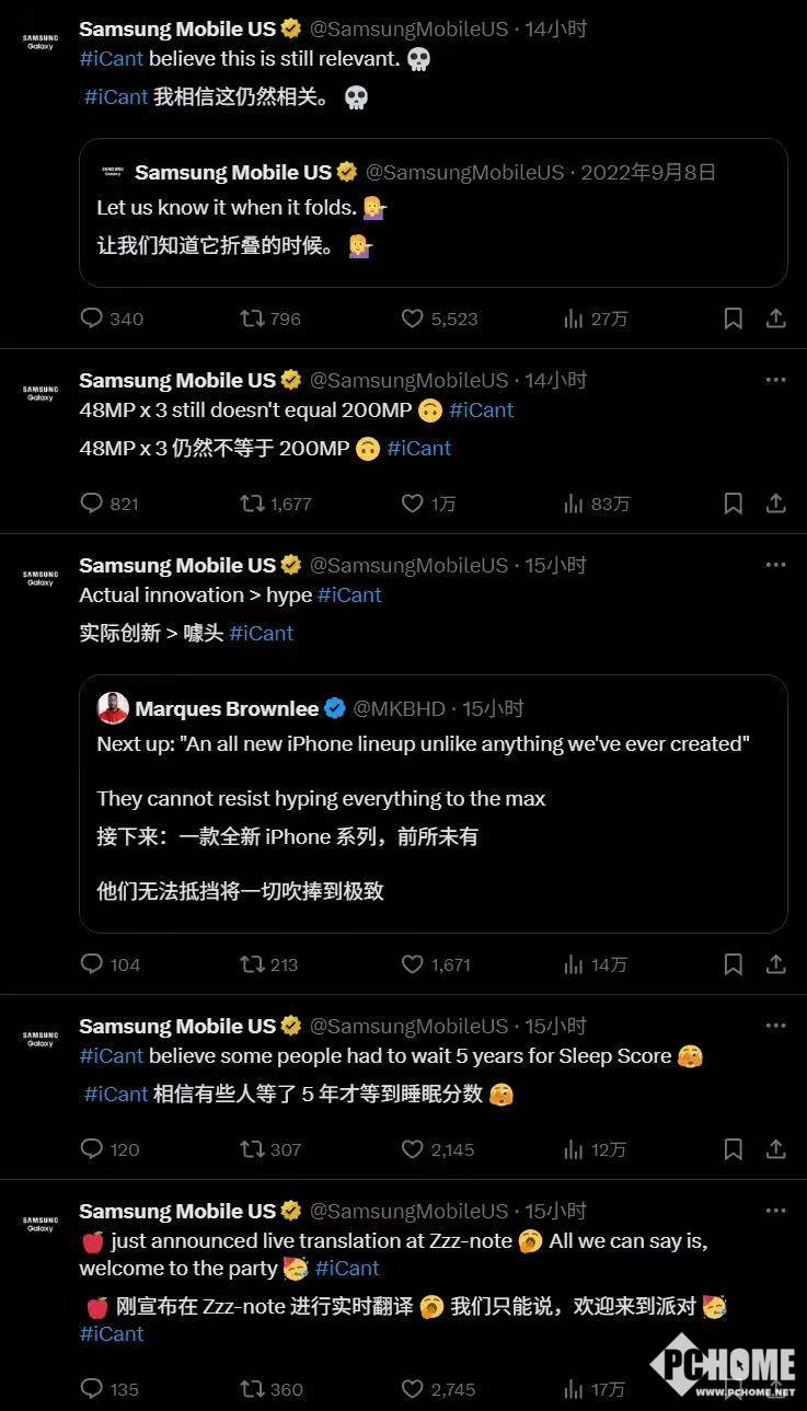 9月10日,苹果于今日凌晨正式发布iPhone 17系列及iPhone Air新机,而长期竞争对手三星迅速通过官方X账号连续发帖,对苹果新品进行多方面质疑。
