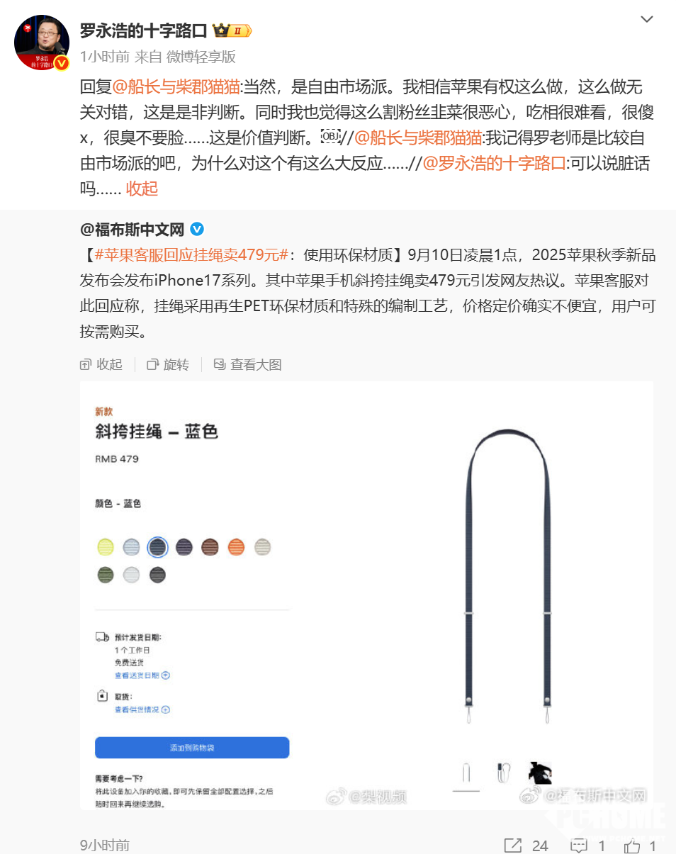 9月10日凌晨,苹果在秋季新品发布会后,上架了一款斜挎挂绳,售价高达479元,引发网友热议。苹果客服回应称,该挂绳采用再生PET环保材质与特殊编制工艺,因此定价较高。