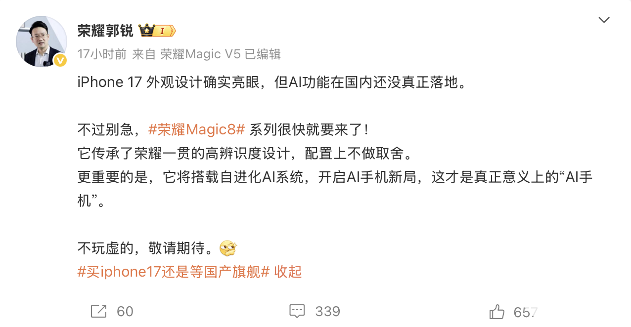 2025年9月10日,苹果秋季发布会推出的iPhone 17系列引发广泛关注。荣耀终端股份有限公司品牌营销总裁、集团首席营销官郭锐发文“点评”iPhone 17。