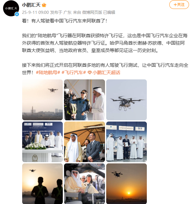 2025年9月11日消息,小鹏汇天官方账号宣布,小鹏汇天“陆地航母”飞行器(X3-F)在阿联酋获颁特许飞行证,正式开启在阿联酋多地的有人驾驶飞行测试,这是中国飞行汽车企业在海外获得的首张有人驾驶航空器特许飞行证。这标志着中国飞行汽车低空载人飞行技术在国际化征程中迈出了关键一步,在中国飞行汽车领域具有里程碑式的意义。
