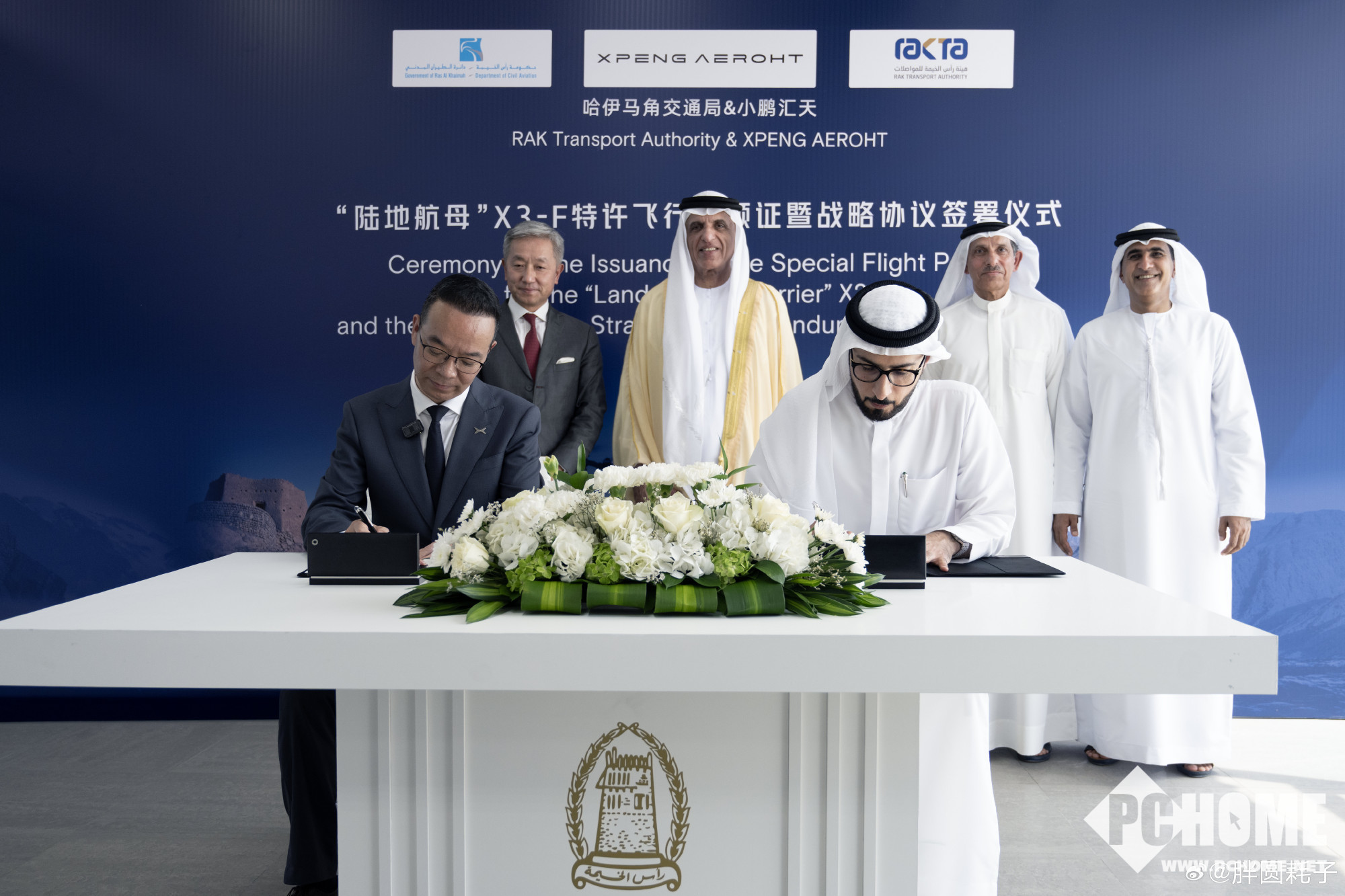 在阿联酋哈伊马角贾济拉飞行基地,小鹏汇天“陆地航母”飞行器(X3-F)缓缓起飞,精准地完成悬停、前飞、360度旋转、左侧飞、右侧飞、协调转弯等飞行动作,哈伊马角酋长谢赫·苏欧德、中国驻阿联酋大使张益明、当地政府官员、皇室成员等人见证了这一历史时刻。