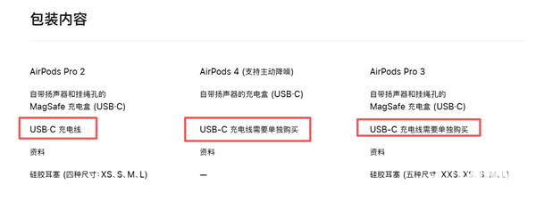 售价1899元的AirPods Pro 3不再随盒附赠USB-C充电线,仅提供耳机与充电盒。据悉,去年AirPods 4就已经取消附赠充电线,当时苹果首次在非Pro系列中取消了充电线。