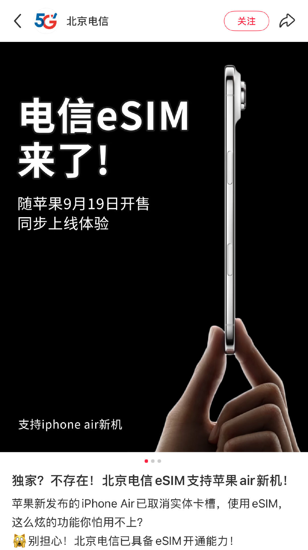 2025年9月11日,北京电信官方账号宣布,北京电信已具备eSIM开通能力,9月19日随iPhone Air开售同步上线体验,且套餐资费、权益不变。