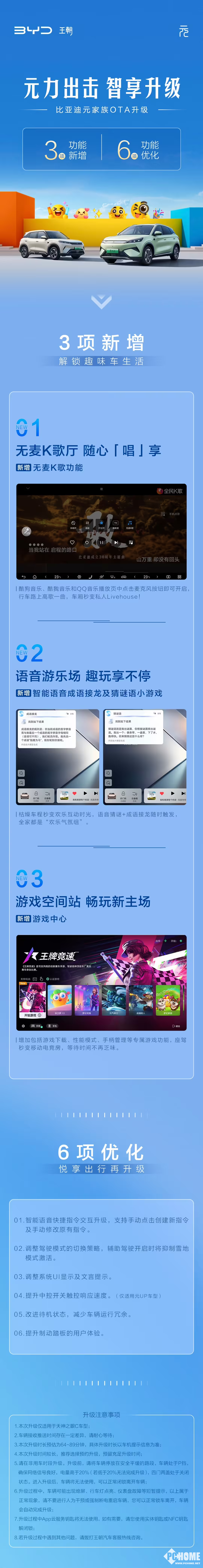 新增功能包括游戏中心、智能语音成语接龙及猜谜语小游戏,以及无麦K歌功能。用户可通过酷狗音乐、酷我音乐和QQ音乐实现车内K歌体验。优化方面涉及系统UI显示、智能语音指令交互、待机状态改进、制动踏板体验提升等。