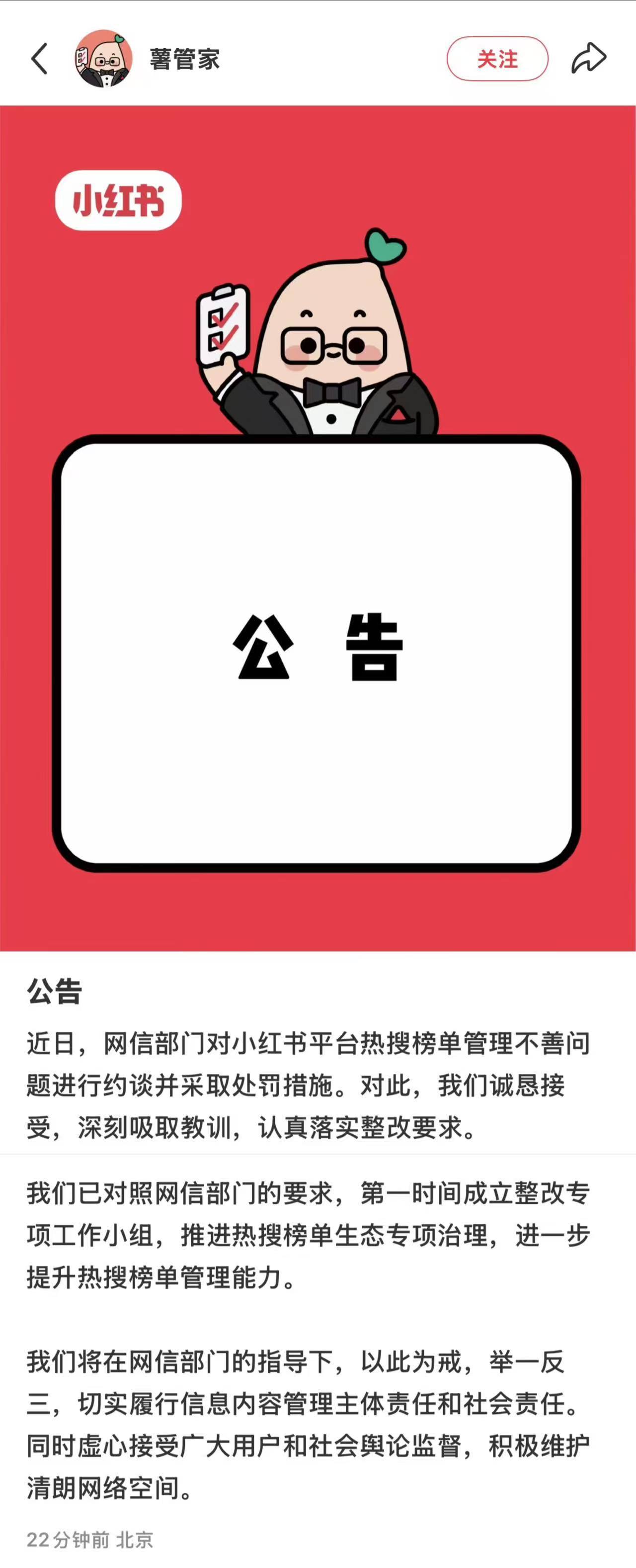 公告显示,小红书平台因未落实信息内容管理主体责任,在热搜榜单中频繁呈现炒作明星个人动态等不良信息,被网信部门依法采取约谈、责令限期改正、警告及从严处理责任人等处置措施。公司表示将以此为契机,全面提升内容管理能力。