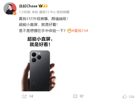 9月12日,realme真我副总裁徐起在微博预热国行版15T手机,这款定位“超能小直屏”的新机以“果味”外观引发不少关注。该机已在海外上市,国行版将随真我15系列同步登场。