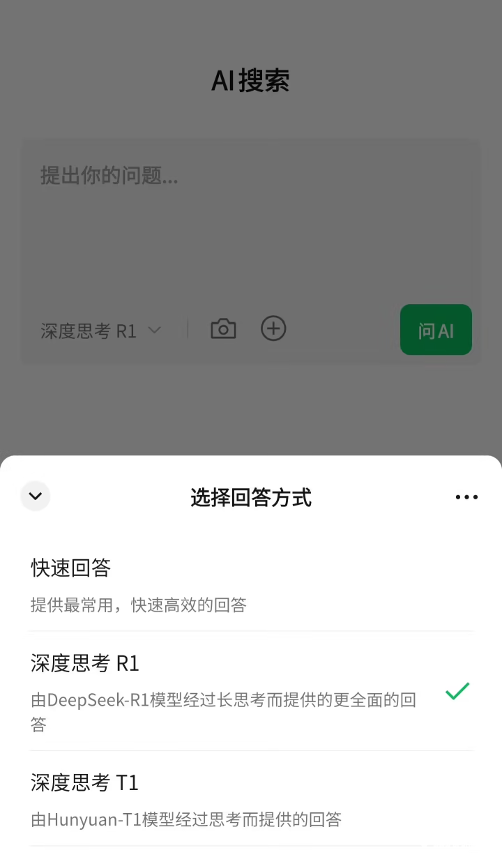 此次更新将AI搜索划分为三大核心板块:深度思考、上传图片、上传文件。其中“深度思考”模块支持双模型选择,用户可切换DeepSeek-R1模型获取联网深度分析,或选用腾讯混元T1模型进行高效推理,另有“快速回答”选项提供简洁答案。多模态交互方面,拍照或上传图片可实现识图、拍题、商品检索,上传文件或公众号链接则能自动生成内容总结。