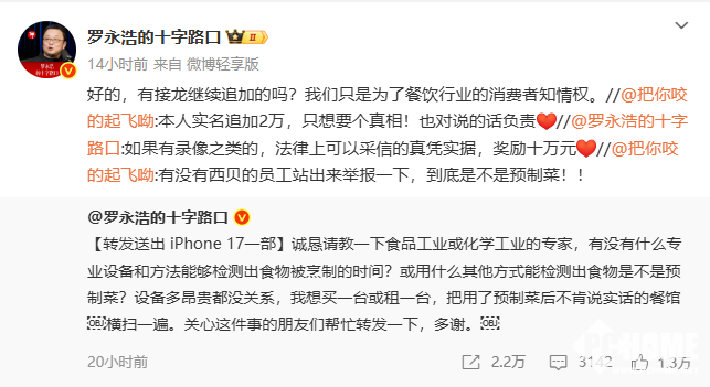 罗永浩则在微博反讽“现做菜吃出加热味是高科技”,并悬赏10万元征集证据,随后有网友追加2万元悬赏。罗永浩强调餐饮企业应明确告知预加工情况,“我们只为消费者知情权”。