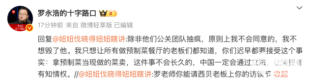 对此,罗永浩在社交媒体平台发文称,“除非他们公关团队抽疯,原则上我不会同意的,我不想毁了他。”罗永浩进一步表示,自己只想让所有做预制菜餐厅的老板们都知道,你们迟早都要接受这个事实:拿预制菜当现做的菜卖,这件事不会长久的,中国一定会通过立法,让消费者有知情权。