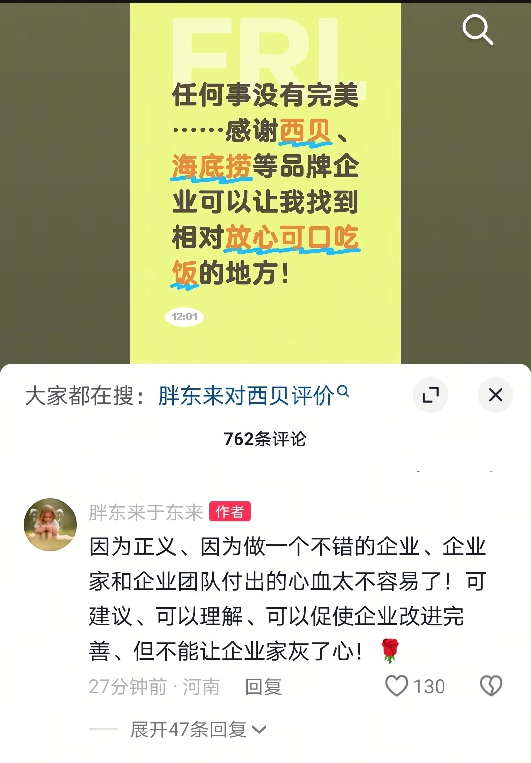 不过西贝也赢得了重量级企业家的声援。9月12日,胖东来CEO于东来在社交媒体发文表示:“任何事没有完美...感谢西贝、海底捞等品牌企业可以让我找到相对放心可口吃饭的地方! ”。于东来在评论区进一步表示:“因为正义、因为做一个不错的企业、企业家和企业团队付出的心血太不容易了!可建议、可以理解、可以促使企业改进完善、但不能让企业家灰了心!”