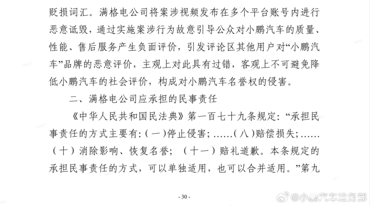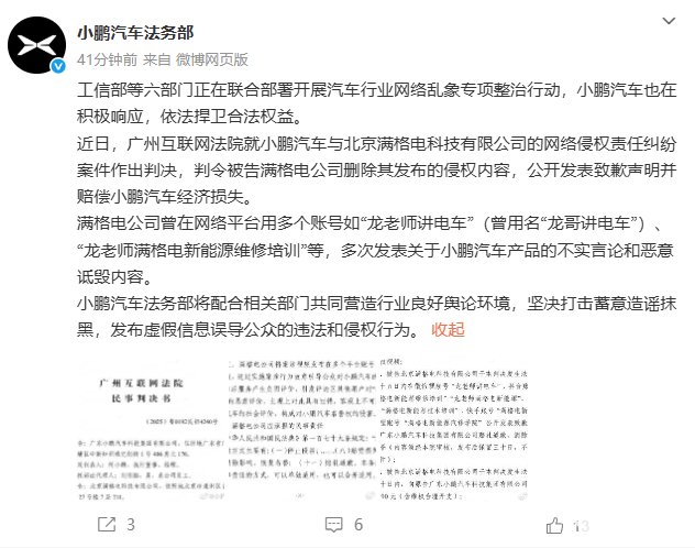 9月12日,小鹏汽车法务部宣布,广州互联网法院就其与北京满格电科技有限公司的网络侵权纠纷作出一审判决:被告满格电公司需立即删除侵权内容,在涉案平台公开发布致歉声明,并赔偿小鹏汽车经济损失10万元。此案成为工信部等六部门开展汽车行业网络乱象专项整治行动以来的典型案例。