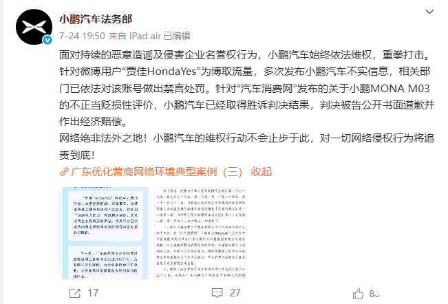小鹏汽车法务部表示,此类恶意诋毁行为已超出正常商业评论范畴,涉嫌违反《反不正当竞争法》。公司将持续配合监管部门,对蓄意造谣、误导公众的行为采取零容忍态度。