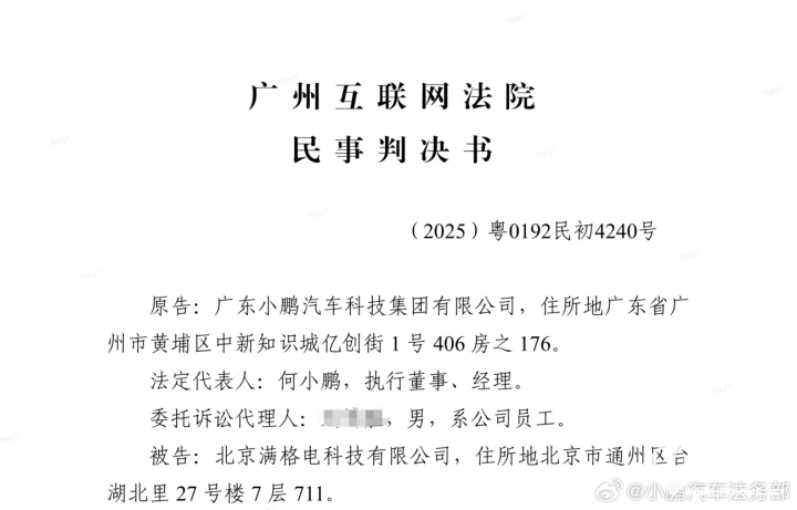 9月12日,小鹏汽车法务部宣布,广州互联网法院就其与北京满格电科技有限公司的网络侵权纠纷作出一审判决:被告满格电公司需立即删除侵权内容,在涉案平台公开发布致歉声明,并赔偿小鹏汽车经济损失10万元。