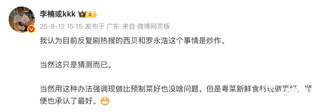 2025年9月12日,前魅族科技副总裁、Angry Miao创始人、财经观察官李楠在社交媒体平台表示,“我认为目前反复刷热搜的西贝和罗永浩这个事情是炒作。当然这只是猜测而已。”