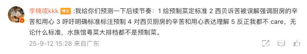 值得注意的是,李楠还在社交媒体平台预测了上述事件后续的发展节奏:1、给预制菜定标准;2、西贝诉苦被误解强调厨房的辛苦和用心;3、呼吁明确标准标注预制;4、罗永浩对西贝厨房的辛苦和用心表达理解。