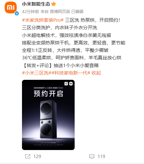 9月12日,小米智能生态官方宣布,米家洗烘套装Pro三区洗+热泵烘正式开启预约。这套由10kg三区洗衣机与12kg热泵烘干机组成的高端家电,定价19999元,是小米在大家电高端化赛道的又一重要布局。