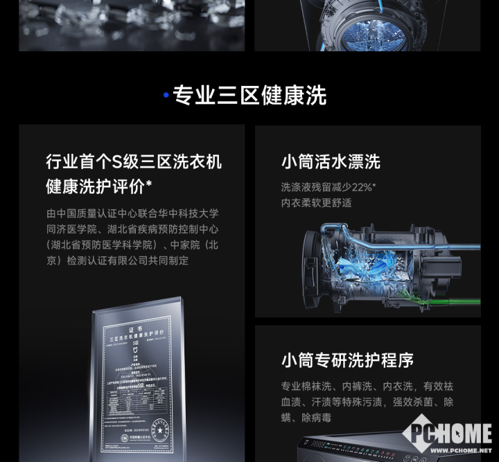 洗衣机核心亮点在于三区独立洗护设计,通过物理隔离仓实现内衣、袜子、外衣同步分洗,彻底解决传统混洗的交叉污染问题。其搭载小米自研超电解技术,能通过电解水生成活性物质,实现99.99%除菌率与强效祛渍,获中卫安医护级健康认证。