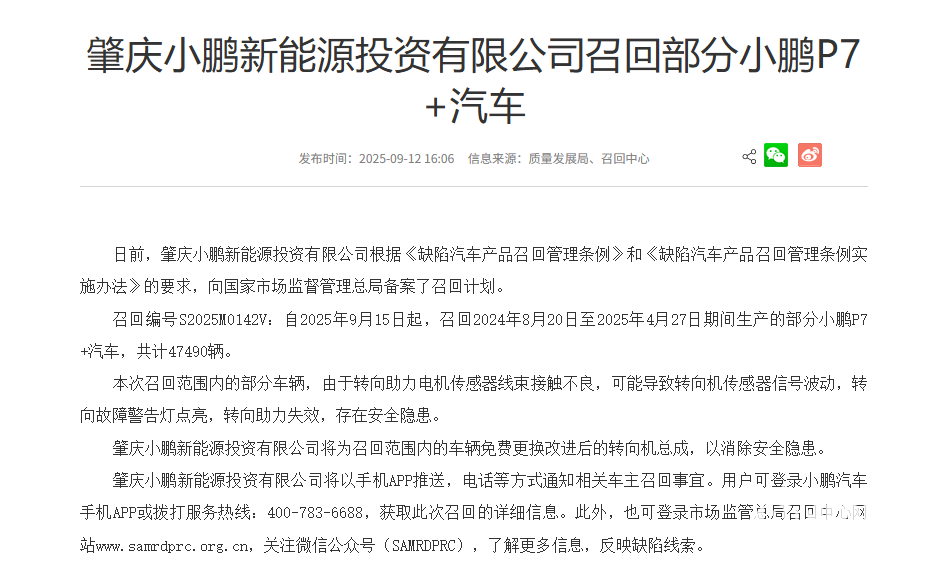 9月12日,国家市场监督管理总局公告显示,肇庆小鹏新能源投资有限公司已备案召回计划,自9月15日起,召回2024年8月20日至2025年4月27日生产的部分小鹏P7+汽车,共计47490辆,此次召回源于转向系统安全隐患。