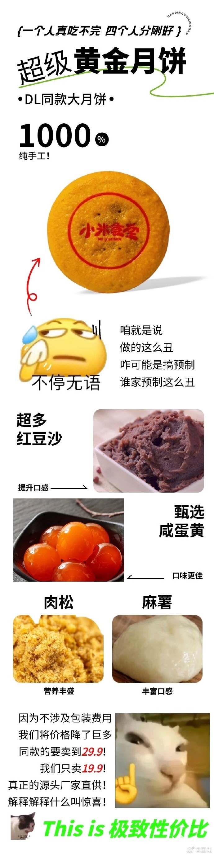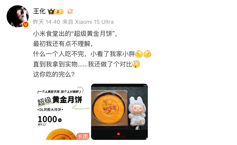 昨日,小米集团公关部总经理王化在社交媒体展示公司食堂自制月饼,并配文“做得这么丑,不可能是预制”。这款“超级黄金月饼”为由小米食堂自主研发,主打纯手工量大。王化在发文中表示,最初对“一人吃不完”的说法不以为然,直到见到实物才理解这一描述。他还通过配图进行了实物与泡泡玛特旗下热门IP形象LABUBU做对比。