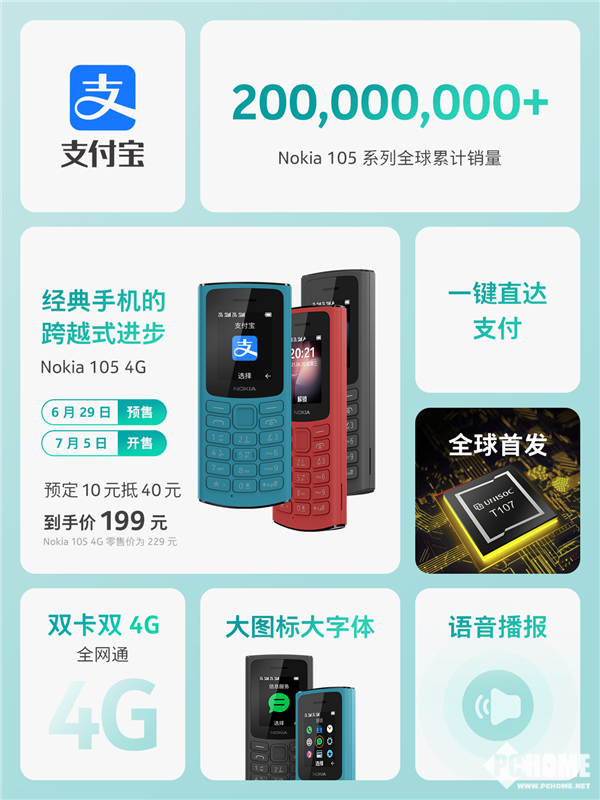 今日,诺基亚105 4G正式发布,提供红色、黑色、蓝色三款配色,零售价229元,将于6月29日开启预售,7月5日在诺基亚手机官方商城、京东、天猫、苏宁、拼多多等电商渠道正式开售。诺基亚105 4G是HMD Global在中国市场带来的首款支持支付宝的经典手机。